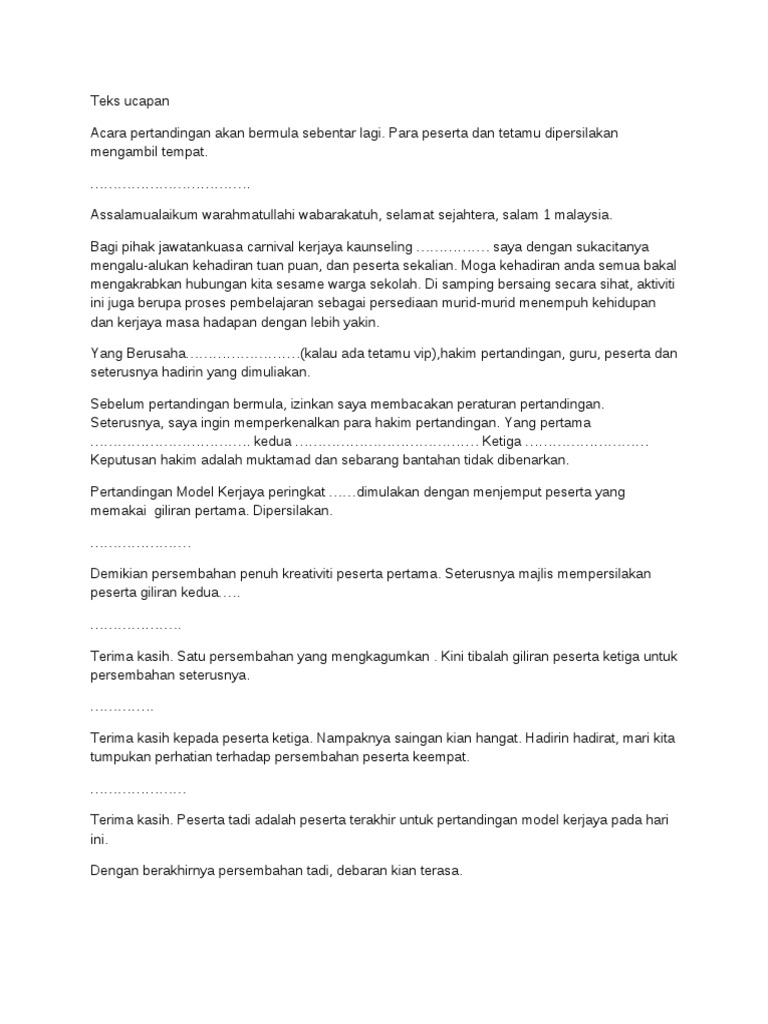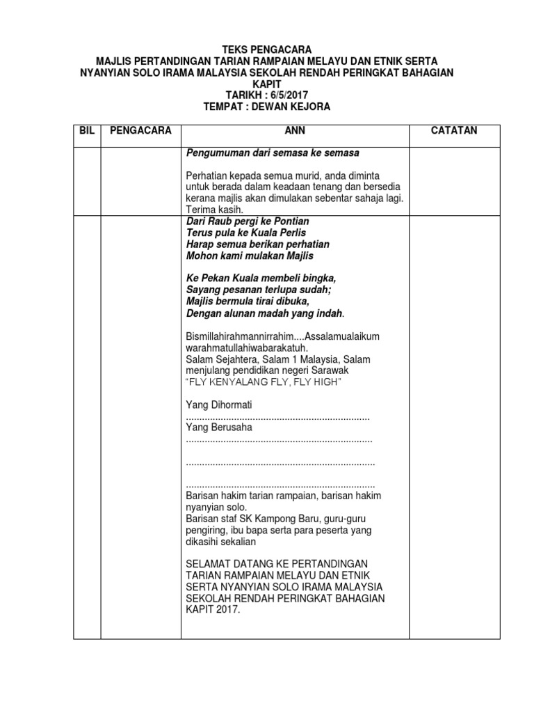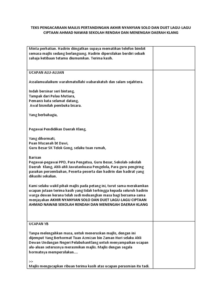 Teks Pengacaraan Majlis Pertandingan Akhir Nyanyian Solo Dan Duet Lagu Pdf