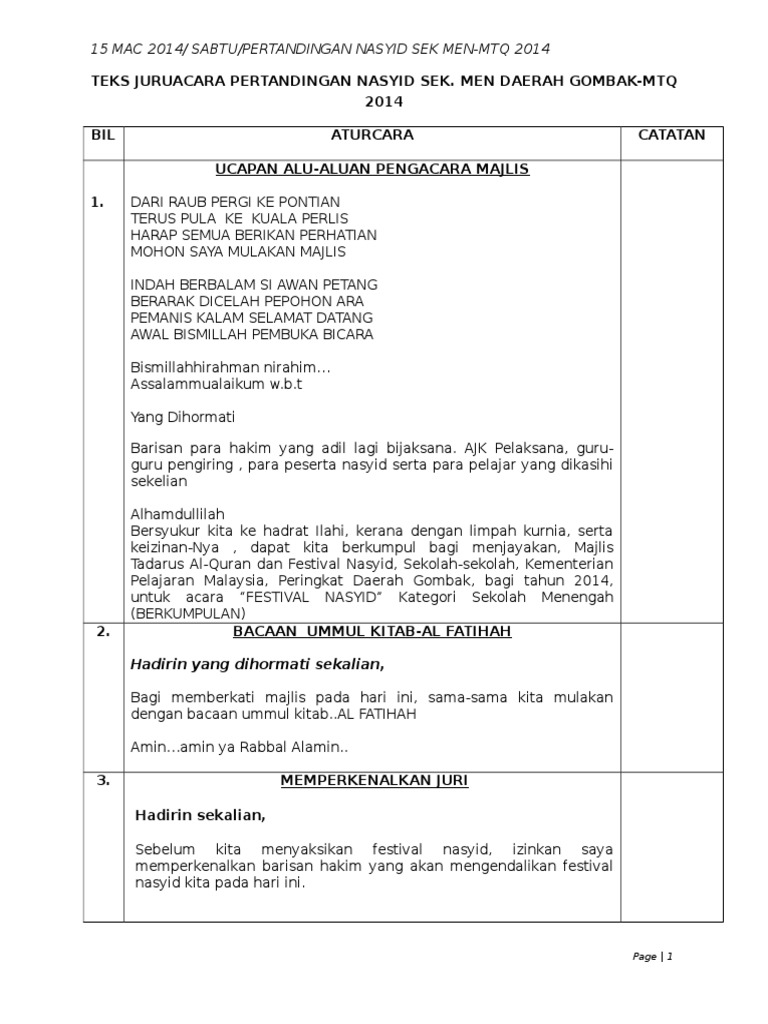 Teks Pengacara Majlis Pertandingan Nasyid Sek Men 2014 Mtq Pdf